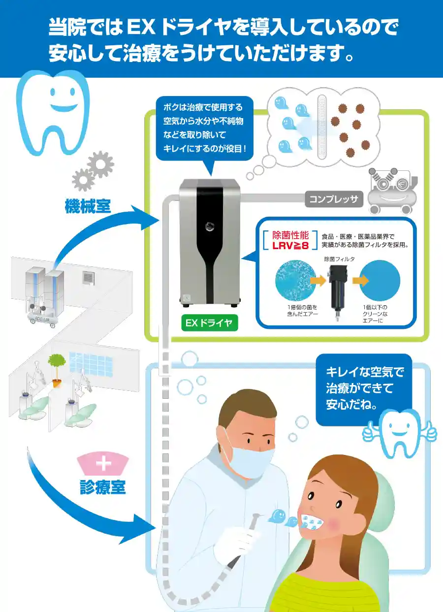 また、診療室内にエアタービンなどで出てくる空気も、空気内のエアーを除菌フィルタを通して外の空気よりもきれいな空気を送り込んでいます。